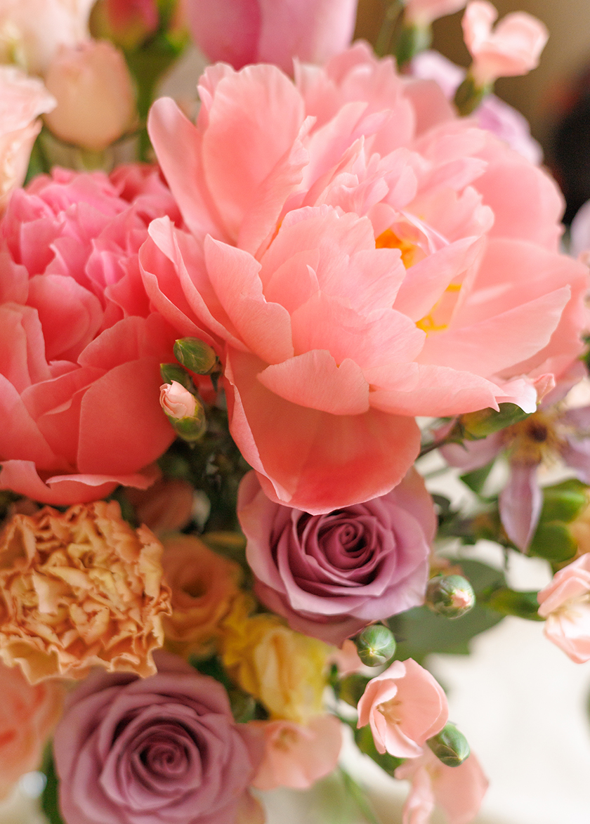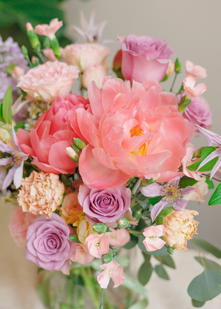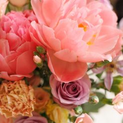 The colour palette of coral and purple, this vibrant bouquet symbolizes