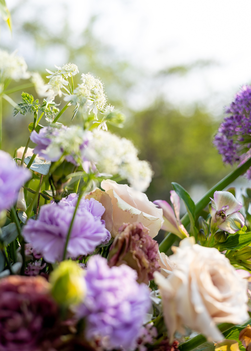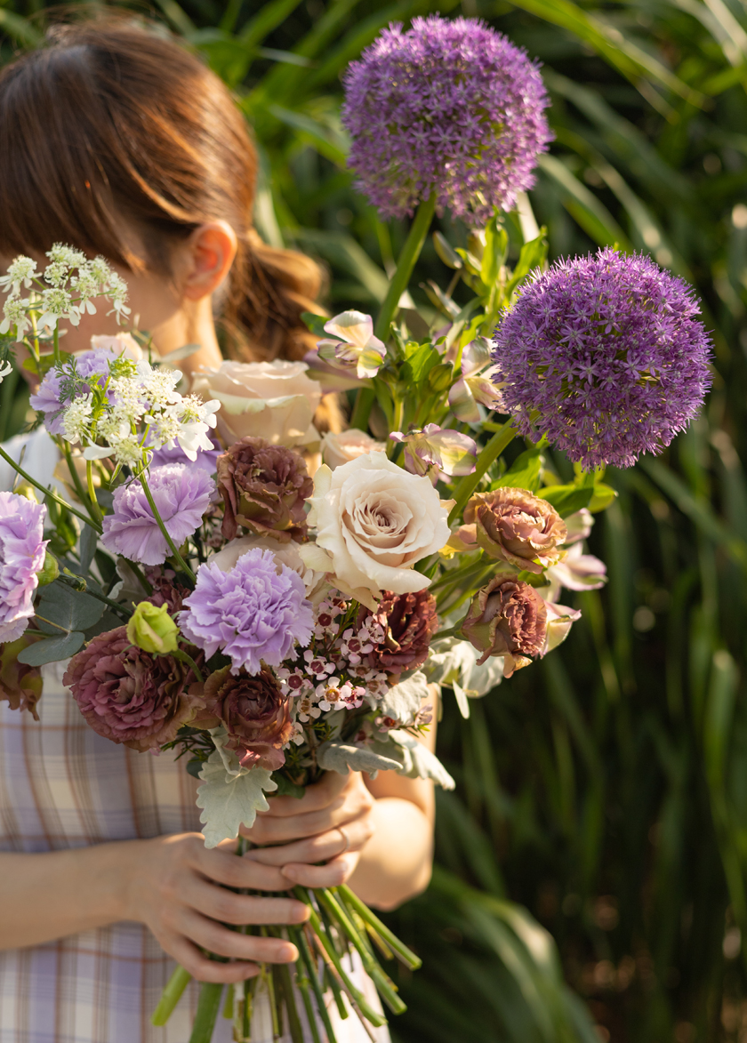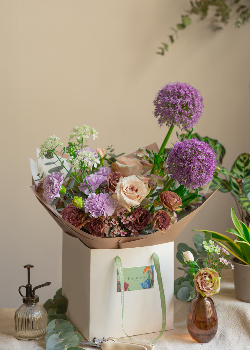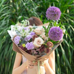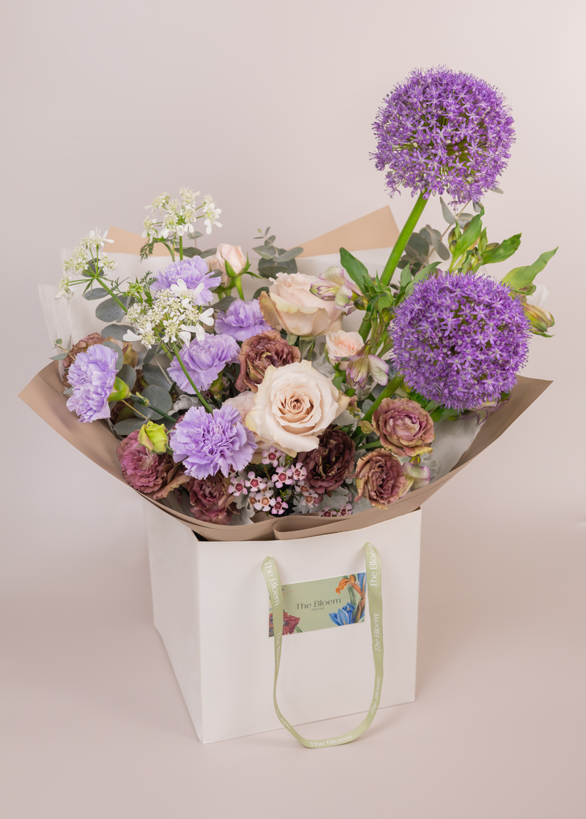 in a stunning mix of Allium, Carnation, Rose, Alstroemerias and Eustoma.